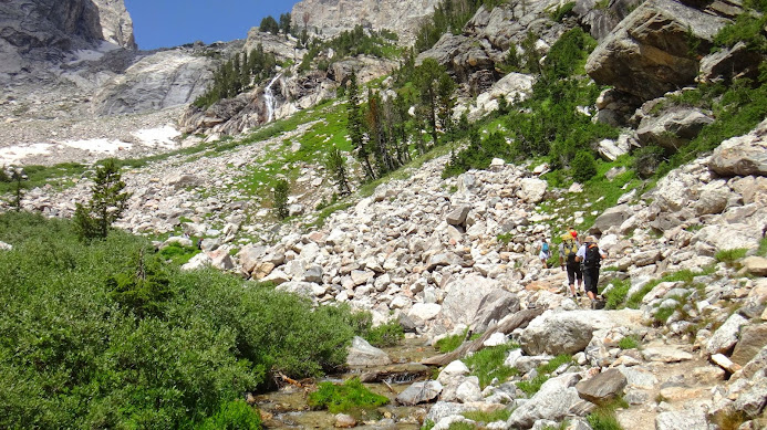At the Meadows Camping Zone, the trail splits toward the South Fork of Garnet Canyon. Do not cross the creek like Kilian Jornet and Anton Krupicka who headed toward the Middle Teton's South Col thinking it was the Lower Saddle. A common mistake. Stay on the creek's north side.